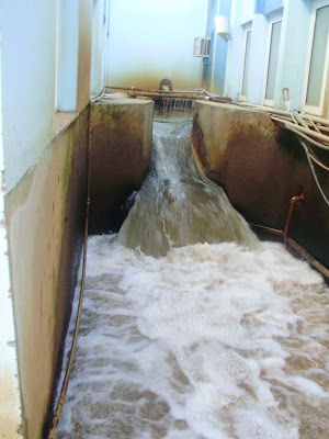 Entrada da água bruta na ETA. Este dispositivo é um dos mais comuns para canais de escoamento abertos, medindo a vazão máxima ou de pico (Calha Parshall).